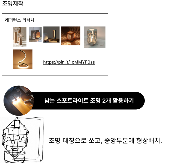 어떤 조명을 만들지 찾아보기 위해 핀터레스트에서 여러 이미지를 찾아 보았다. 그 다음, 이미지의 맨 아래 있는 모습처럼 조명이 대칭으로 빛을 쏘고, 그 사이에 오브젝트를 두어 빛과 그림자의 대비를 통해 재미난 효과를 만들어 보고자 기획하였다.